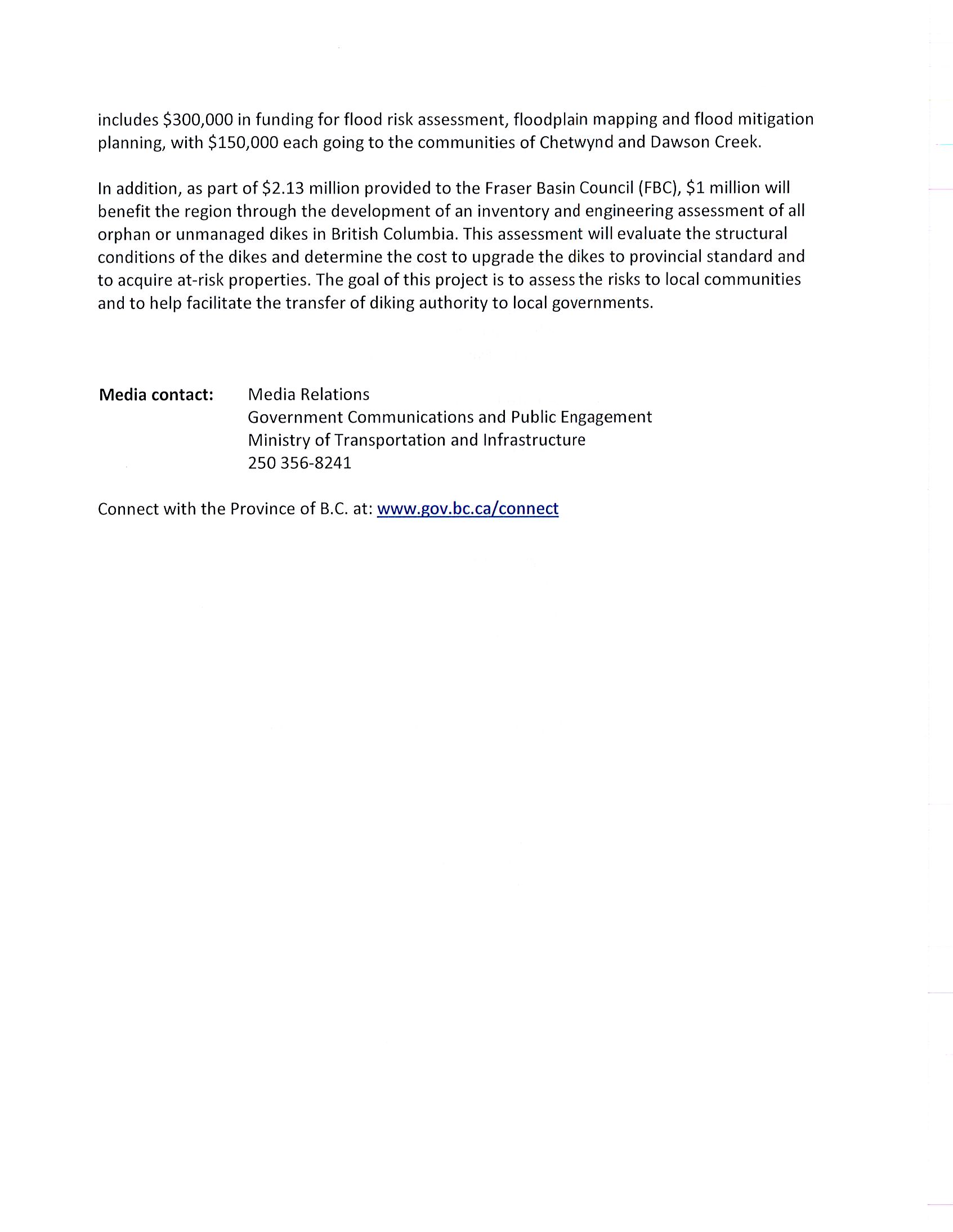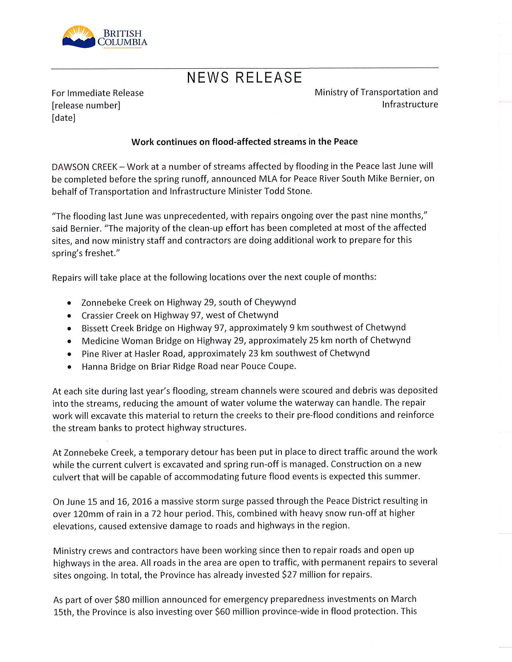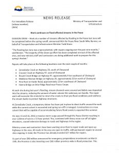 News Release – Work continues on flood-affected streams in the Peace
